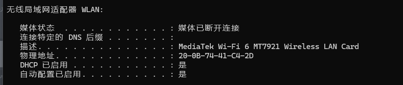 ipconfig -all如果是有线就查看无线局域网适配器WLAN的相关参数
